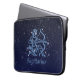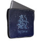 Laptop sleeve featuring the symbol for Sagittarius in soft silver blue, overlaid with the stars of the constellation, against a starry sky background graded from deep midnight blue to black