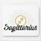 Zodiac themed design features gold starburst accented Sagittarius astrology symbol with black text.