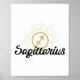 Zodiac themed poster features gold starburst accented Sagittarius astrology symbol with black text.