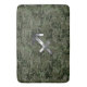 A silver metallic like Sagittarius zodiac sign on a green olive woodland style digital camouflage design texture print background. A modern urban racy design for a great custom birthday gift idea.