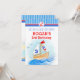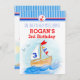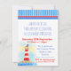 Nautical theme kids 3rd birthday invitation. Cute sail boat whimsical art on front and lighthouse watercolor art on the reverse in blue, red and white. Personalise with your own party details. Original watercolor whimsical paintings and design by Sarah Trett.