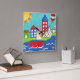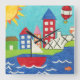 A cityscape serves as the background for a sailboat and a hot air balloon. A bright sun shines down on the scene, and a cute fish swims under the water. Purchase this peaceful print today!
