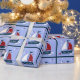 A graphic design of sailboat, dolphins, and seagulls on wrapping paper. The gift wrap has a template for your personalisation. Designed by Charmaine Paulson