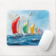 A fleet of sailboats with vibrant sails in red, green, yellow, and blue glides across a choppy sea under a clear sky