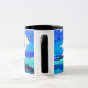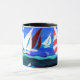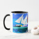 A ringer mug, white with black handle and rim, the sailing boats design is made from a handpainted paper collage.