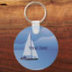 A graphic illustration of a sailboat on the water on a keychain. Original artwork: Copyright Charmaine Paulson