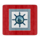 Nautical themed design with sailing scene decoration in striped squares on red background