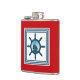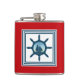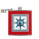 Nautical themed design with sailing scene decoration in striped squares on red background