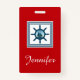 Nautical themed design with sailing scene decoration in striped squares on red background with name