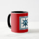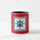 Nautical themed design with sailing scene decoration in striped squares on red background