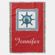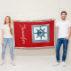 Nautical themed design with sailing scene decoration in striped squares on red background