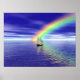 Sailboat sailing towards a vibrant rainbow.