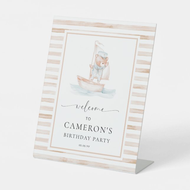 This birthday welcome sign features a timeless beige tan stripe design with a sweet watercolour sailor teddy bear illustration. The script "welcome" heading is an image that cannot be edited. All of the other text is fully editable. For more advanced customisation of this design, simply select the "Customise It" button above.