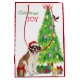On each side of this Holiday gift bag, a Saint Bernard Dog wears a red and white Santa hat while he sits beside a Holiday tree. Around the dog brightly wrapped gift packages are scattered about. A bullfinch is landing on the Christmas tree. The red and green text says "Christmas JOY".