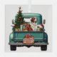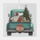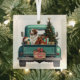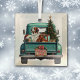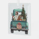 A teal blue pickup truck carries a decorated Holiday tree and gift packages on this cute glass Christmas ornament. Alongside the tree sits a beautiful Saint Bernard Dog. A Santa Claus hat sits on one of the gift packages, and a rustic wooden sign on the back bumper says "Christmas Cheer".