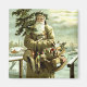 vintage Christmas greeting card: Saint Nicholaus crossing bridge into town, with sack full of gifts