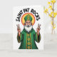 This card shows Saint Patrick centered on a bright white background, standing in emerald green robes with a matching mitre decorated in golden Celtic-style patterns. A warm yellow-and-orange halo radiates behind his head, framing his wide grin and flowing white beard in a way that feels friendly and a little flirty, like he’s posing for someone he adores. Both hands are lifted near shoulder height, and his fingers form peace signs that read as an easygoing “we’re in this together” gesture 💚. Above him, the phrase “SAINT PAT ROCKS” arches across the top in large, dark lettering that stands out sharply against the white space. The robe details use rich gold accents and repeating motifs that add texture and a dressed-up look without crowding the scene. The strong outlines and simple shapes keep the figure crisp and graphic, while the warm halo colors add a cozy glow around his face ☘️. The final look is a single central character with green-and-gold clothing, a sunburst halo, raised peace-sign hands, and arched headline text at the top.