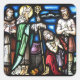 Vintage stained glass image of Saint Patrick with his followers bestowing a blessing on a man.
