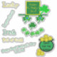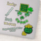 Happy Saint Paddy's Day. Fun cute Leprechaun made up of green shamrocks for eyes, nose and mouth. He has a festive green gold hat on with a shamrock decoration. Pot of gold has golden coins and the wording, Gold for the keepin'. Irish sayings including Leprechaun, pot of gold to laser cut stickers. Original Artwork Design © TamiraZDesigns.