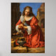 In her hands she holds a wooden crucifix and wrings a cloth that drips into a metal vessel below, the liquid painted with careful realism. The bright blue sky behind her sets off the warm reds and golds, while the background architecture frames her, with dark masonry to one side and a domed building to the other. A distant figure stands in a doorway, small and secondary, which emphasizes how the composition centers on the kneeling saint.