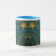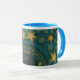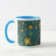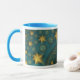 Coffee mug with "Saint-Remy Revisited" an abstract design by Susan Wallace. Copyright © 2007, Susan Wallace. Bright gold stars repeat endlessly on a field of vibrant turquoise. Full wrap-around design.