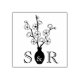 Cherry blossom branches arranged in a simple vase. Two initials surround the base with an ampersand partially hidden on the vase itself.