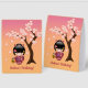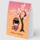 Vector illustration of a cute oriental girl in a dark cherry kimono dress with wide obi sash holding a yellow festival paper lantern. The girl's black hair is decorated with flowers and geisha style hairpins. This artwork was inspired by traditional kokeshi dolls of Japan. Sakura is a Japanese Cherry tree, also used as a girl's name. Blooming cherry tree makes a simple background.