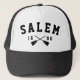 Show some witch pride with our cute Halloween hat featuring "Salem" in black collegiate lettering with two crossed broomsticks flanked by the year 1692.