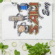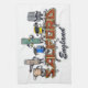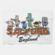 The landmarks and icons of the City of Salford, in Greater Manchester, England, featuring a stylised cartoon character versions of its exports and cityscape, including (from left to right) an Eccles Cake, The Lowry holding up a coal barge, a University of Salford building at Salford Quays, 100 Greengate holding maracas in the style of the Happy Mondays, a Metrolink tram destined for MediaCityUK holding up TV cameras, and, finally, one of the Pendleton tower blocks. Salford is spelled out in traditional red brick and sandstone, with cotton flower embellishment.