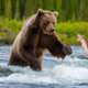 This Salmon Fishing Grizzly Bear jigsaw puzzle offers an action shot image straight out of a nature documentary series. A massive grizzly bear standing in a rushing river is frozen in time as he swipes at a leaping salmon. A vibrant and action packed image highlighted against an otherwise peaceful background of a dense forest of tall pine trees. This brown bear puzzle is sure to please and entice all grizzly bear lovers, especially those who love nature puzzles.