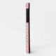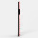 This phone case has an Art Deco design of salmon curved lines in a triangle shape on a field of white repeated across the design.