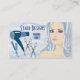 Pretty salon hairdresser female with tools of the trade in blue tones, backside dark blue with blue tones of chevron pattern.