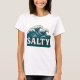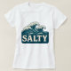 Giant whitecap waves roll toward the beach in this retro style coastal graphic. Cream vintage SALTY text makes a bold contrast against the teal blue ocean. Made for beach bums, surfers, sun seekers and anyone living on island time. This t-shirt is a great way to add seaside vibes to your outfit. | Vivid printing is recommended for non-white garments.