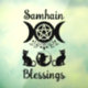 Samhain Celtic pagan Halloween Greeting and Blessing window cling with triple moon, pentacle, black cats and a witch
