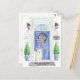 Announce your new address with our stylish announcement featuring a Samoyed, blue front door, welcome mat, slate sign, topiaries and a floral wreath set on a grey brick background.