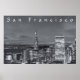 This black and white photograph captures the San Francisco skyline at night. The iconic Transamerica Pyramid stands prominently among other illuminated skyscrapers. The city lights reflect off the water in the background, creating a shimmering effect. The sky is filled with clouds, adding depth to the scene. The overall mood is serene and urban.