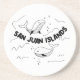 Simple cartoony design with wales, bubbles, and waves and "San Juan Islands" written in bold text.