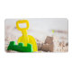 Sand castle and beach toys at tropical coast