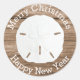 Sand dollar Christmas envelope seal. Rustic brown wood background with white, curved text to customise in two places. Say "Merry Christmas and Happy New Year", from a tropical location. Round stickers come in two sizes and can be used to seal envelopes. Changing the shape of this design may disrupt the wording.