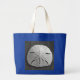 A sand dollar rests on the sandy beach with gentle side lighting from the sunset. Image is a photograph taken at Playa Grande, Costa Rica on the Pacific Coast. Customise this sea shell tote bag with your own text and images to make a special seashell gift!