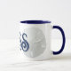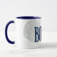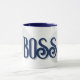 Boss coffee mug with white sand dollars design and big, bold "boss" text. Contemporary style for the choosy boss in dark blue and white. The text is done in two layers to give the appearance of a shadow. Two white sand dollars are the background and this style of mug had a dark blue interior. The design also works on the larger mug size and with other colour selections.
