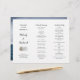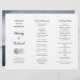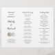 Accordion fold wedding program template with two sand dollars. The 8 x 11 inch paper is white with dark grey text in printed and script fonts. On the front, Include a title and other information about the ceremony. First names only in bolder script. Two more sections hold the “order of ceremony” and “wedding party”. All text is printed with the exception of the headings. Reverse is an image of a big crashing ocean wave. Fold accordion style after purchase - front section folds back and last section folds forward - to make a tall program that opens outward. Choose any type of paper.