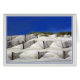 A blue sky forms a backdrop for a series of sand fences and dunes.