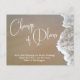 This piece will help alert your tribe that your beach wedding will be rescheduled to another time. This suite of wedding and event designs features my photo of smooth, warm sand accented by white foam as the water kisses the beach. Feel free to replace with your own photo as you like. Key phrases are rendered as elegant white typography graphic accents using a gorgeous script font. In this piece, the "fancy" font says "Change of Plans" and accent words on the back are also coordinated. Use the template fields to easily add your own details and feel free to reword any of my placeholder type to suit your own specifications.