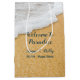 Custom paper gift bags for wedding guests with sand and surf design and custom text. "Welcome to Paradise" can be changed to your wedding location. Include the couple's names and date with location of marriage. Foamy white surf on a tan sandy beach is the image that covers this medium size bag. Or choose the smaller size. This design will not fit the "wine" tall bag or the large size.