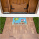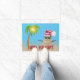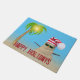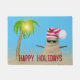 Christmas sand snowman with sunglasses and striped cap in beach sand with holiday lights on palm tree.