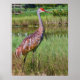 This Sandhill Crane poses nicely on his way down to the pond. He makes a splendid print. The Sandhill Cranes (Grus canadensis), standing about four feet in height, are one of the more numerous large birds that can be found in many places throughout the world.They have bright orange eyes and a red head. Their body feathers can vary from a grey to reddish brown.