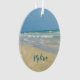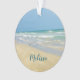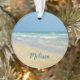 Beautiful beach ornament with gorgeous seaside photography featuring a pretty sandpiper standing at the edge of the ocean waves on a sunny summer day. Lovely blue green water waves roll onto the sandy shore where your name is personalised in cute teal typography. A beautiful Christmas gift for a daughter, mum, grandmother, or granddaughter.