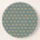 A round sandstone coaster, with a pattern of small red and green hearts on a dark teal background in a 'Folk Art' style.