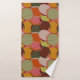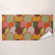 This towel set has a pale pink washcloth, a blush hand towel, and a bath towel with a mid-century modern design of manipulated circles overlapping each other in gold, beet, pink, grey, forest green, light green, orange, and lime. Like this design but want different colours? Message me.